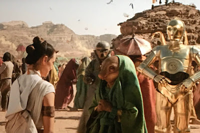 Rey's encounter with the Aki-Aki child on the planet Pasaana seemed a bit pointless to me at first, if well shot. The puppetry/CGI is pretty amazing here, and I think the point of it all is again, part of the A.I. promotion. The realism of these alien "children" are being refined to mimic more convincing human interactions and stimulate feelings than ever before. The "mother/daughter" relationship is hinted at here, but Rey doesn't seem to be interested in romance at all during this trilogy of films - nor would her offspring ever look like this alien child. So we're talking about a mother/daughter relationship resulting from no romance or biological connection. How endearing! It's interesting to consider the "warm" feelings provoked by this scene in contrast to the themes of cloning in the film.