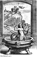 The character depicted is called, or is heavily based upon Melusine. She is often playfully referred to as a "mermaid," which is basically true. But she is always equally associated with being "half serpent." And in fact, one version of the story has her transforming completely into a dragon, not a fish! Although "serpent" and "fish" seem to be used interchangeably to reference the same creature here - probably due to the scaly, circular movements of both. However the 2 tails do recall symbolically the double headed serpent of the caduceus - while the image of Melusine may serve as a "tree trunk," "phallic symbol," or the middle pillar in the tree of life.